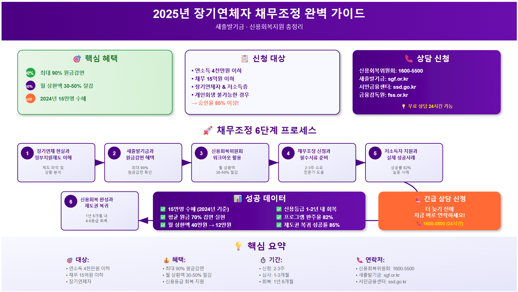 지금까지 장기연체자를 위한 채무조정의 모든 것을 함께 살펴봤습니다. 새출발기금의 최대 90% 원금감면, 신용회복위원회 워크아웃의 월 상환액 30-50% 절감, 그리고 체계적인 신용회복 과정까지 모든 정보를 제공해드렸습니다.