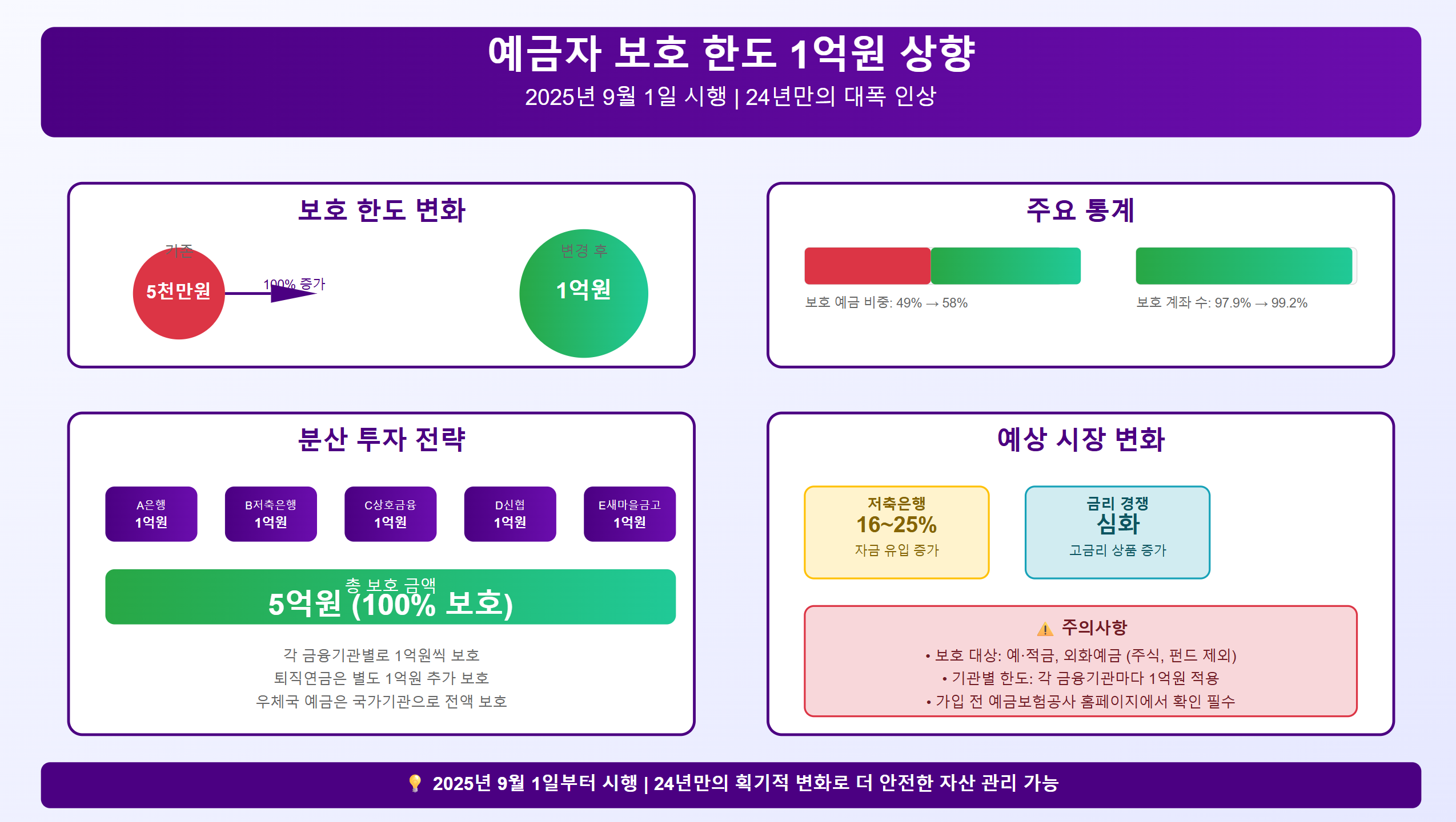 예금자 보호 한도 1억 상향이 2025년 9월 1일부터 시행되면서 2025년 하반기 금융시장은 새로운 국면을 맞이할 것으로 전망됩니다. 24년만의 대폭 상향으로 인한 파급효과가 본격적으로 나타날 것으로 예상됩니다.