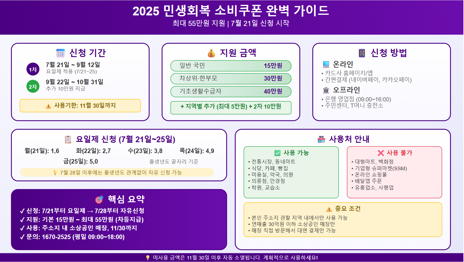 지금까지 2025 민생회복 소비쿠폰의 모든 것을 함께 살펴봤습니다. 기본 15만원부터 최대 55만원까지의 차등 지급, 요일제 신청 시스템, 사용처 제한 등 복잡해 보이는 내용들이 이제는 명확해지셨을 것입니다.